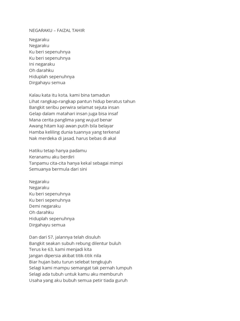 Negaraku Negaraku ku beri sepenuhnya ku beri sepenuhnya demi negaraku oh darahku hiduplah sepenuhnya dirgahayu semua Dan dari 57 jalannya telah disuluh bangkit seakan subuh rebung dilentur buluh terus ke 63 kami menjadi kita. From the Album Negaraku August 26 2016 129 Start your 30-day free trial of Unlimited to listen to this song plus tens of millions more songs. Faizal Tahir Ezra Kong dan Mike Chan Penulis Lirik.